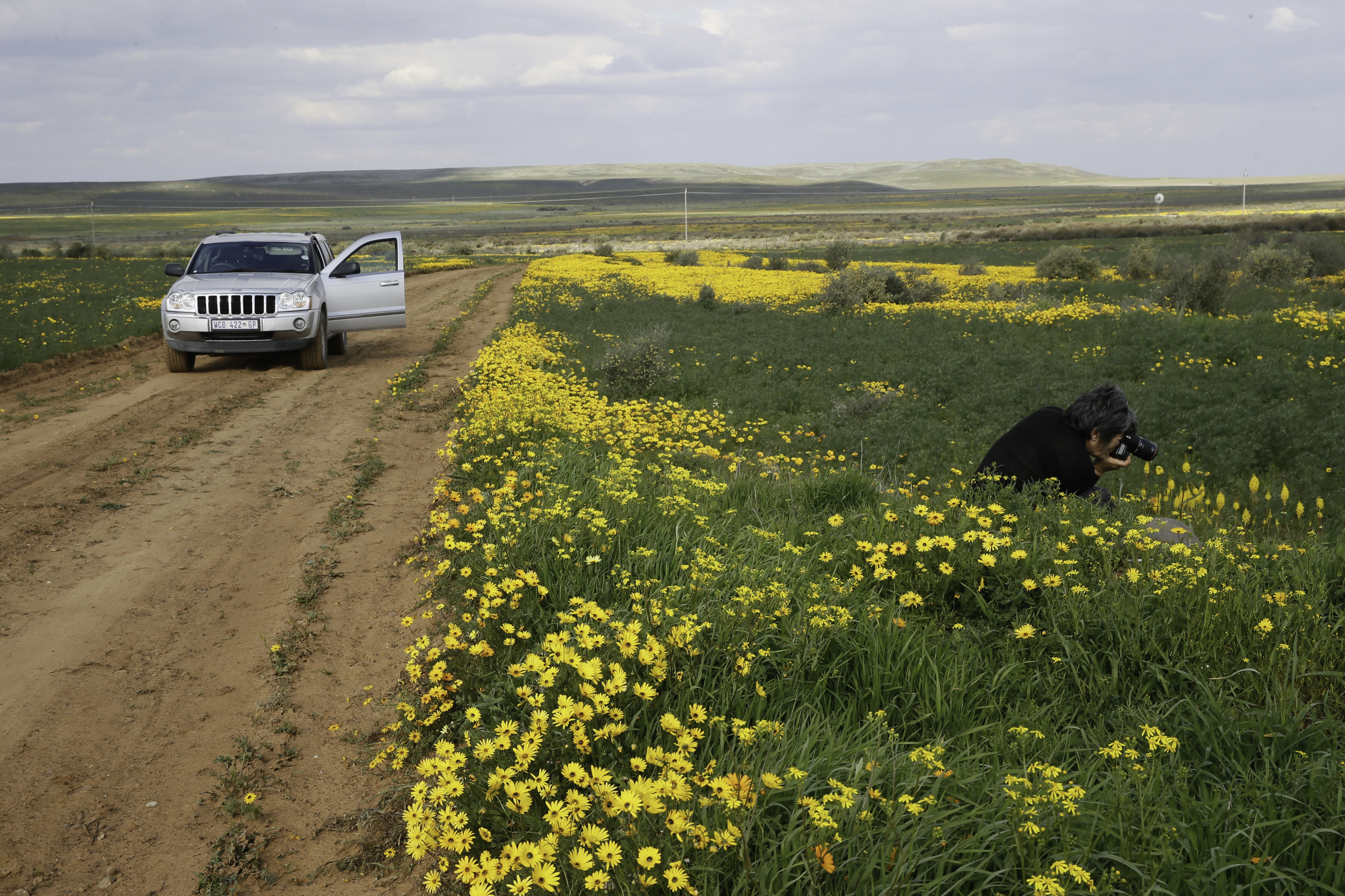 We leave after breakfast around 8am in very thick fog, quite despondent that we might not see, and definitely do not see flowers the next two hours. Thankfully the fog abate around Garies and we start seeing some flowers.