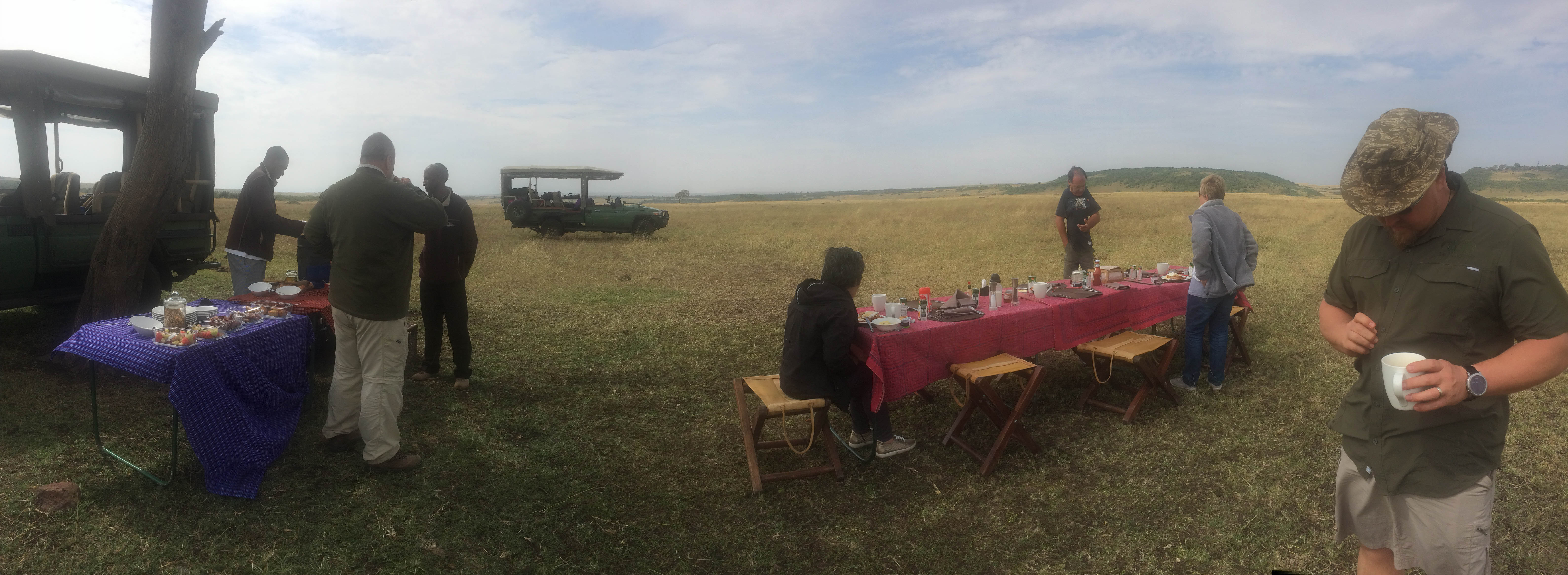 In between I have forgotten to mention that we get served full english breakfast out on the plains and the same exercise is repeated at lunch time. That allows us to make it during the 13 arduous but enjoyable hours every day. Duncan is in radio contact with his team and we just suddenly find a land cruiser market under a wild date tree, complete with table. The cumberland sausages and crispy bacon has become a hit and we all pine for it before the day gets very old.