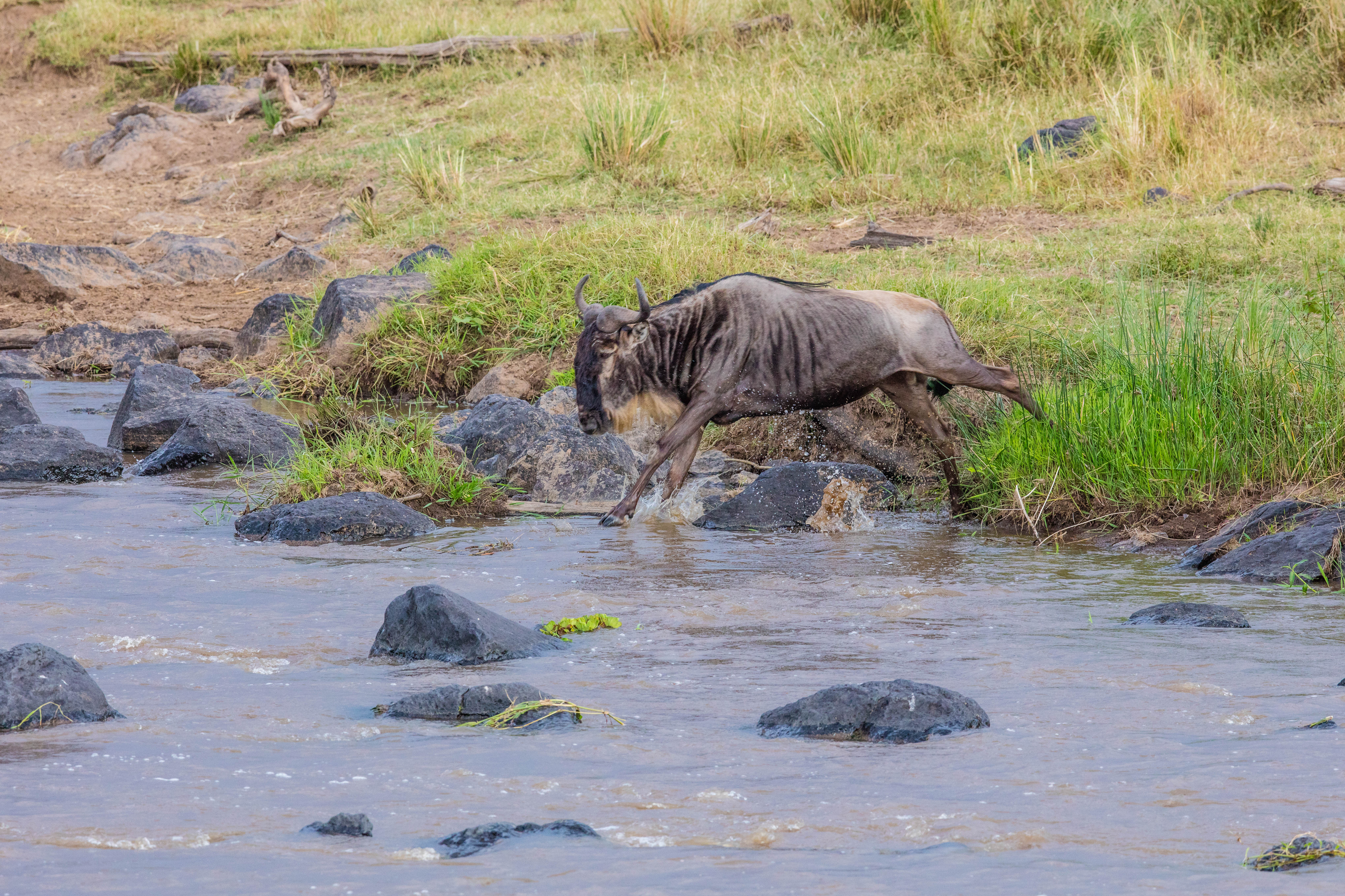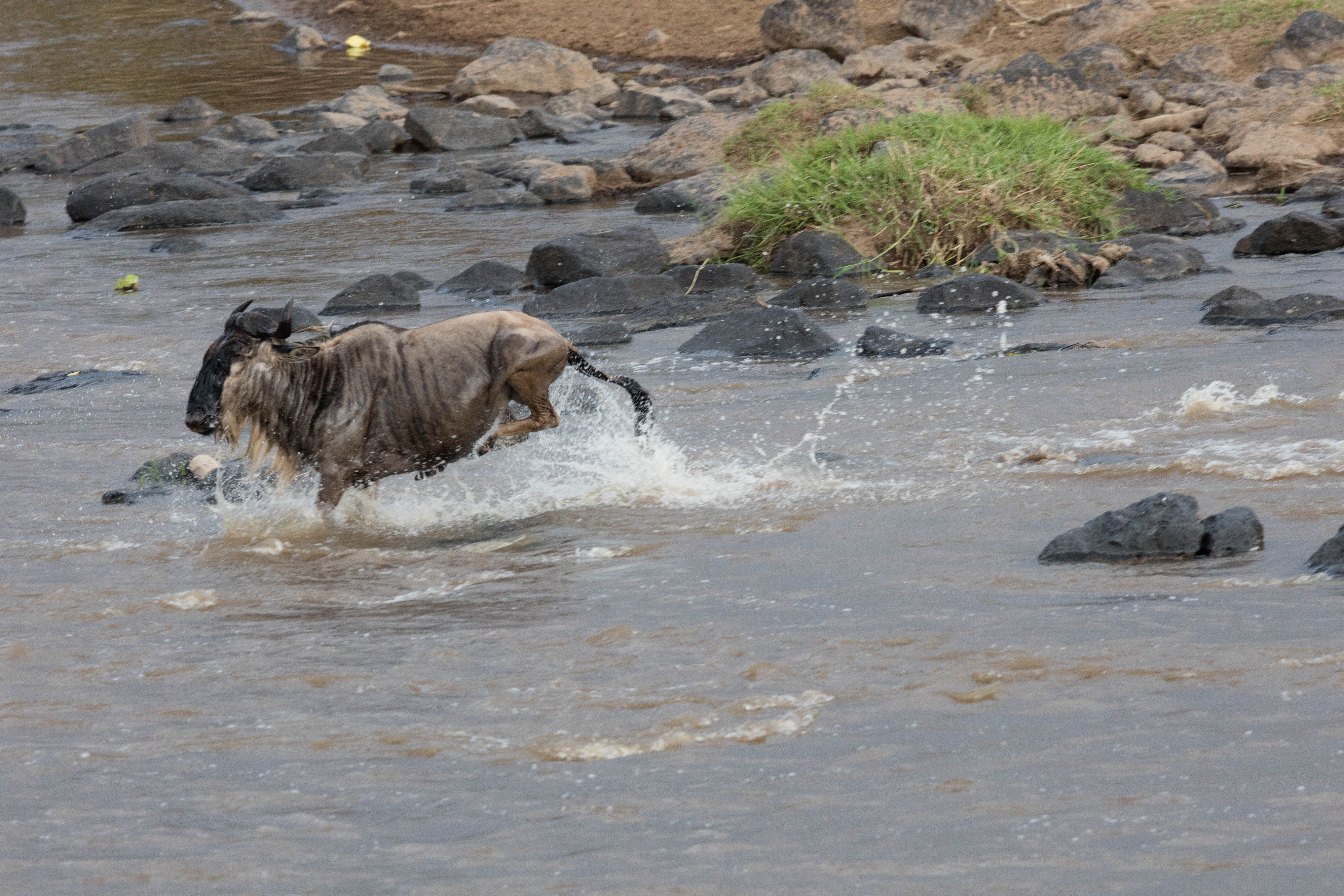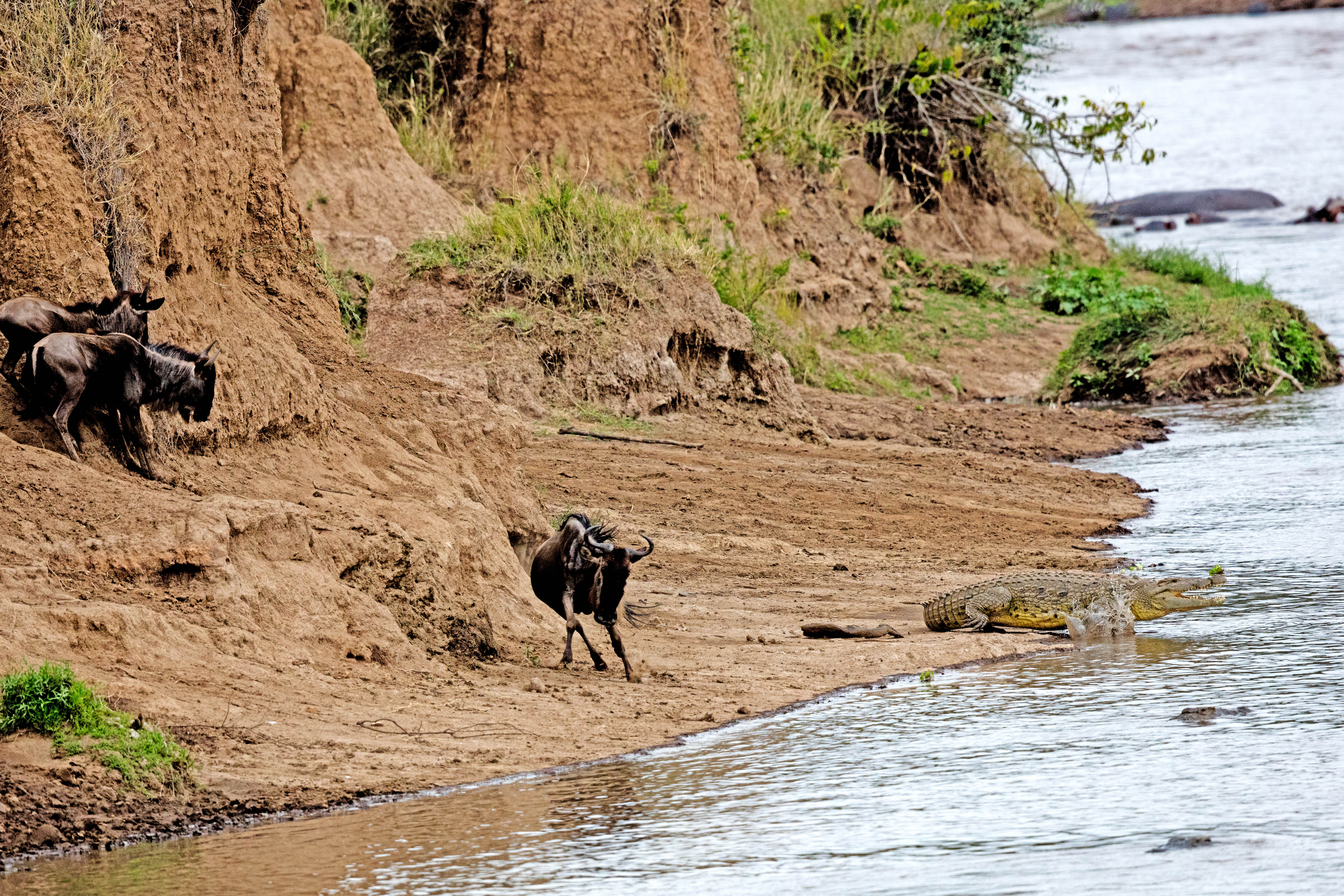 On the way back we witness our first big wildebeest crossing alas not over the Mara but one of its tributaries. Finally we have something. We can return safely and happy after the busy day.