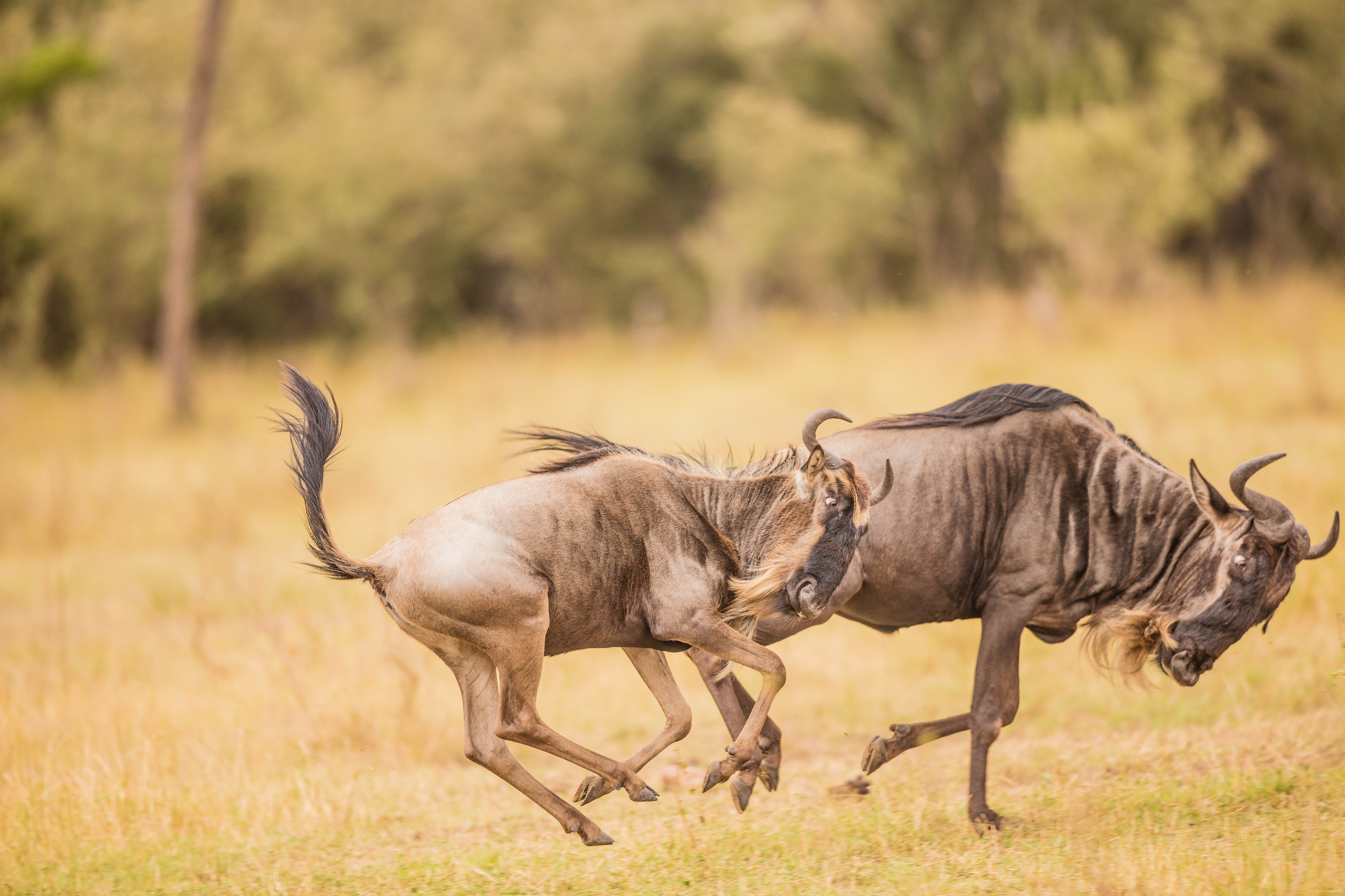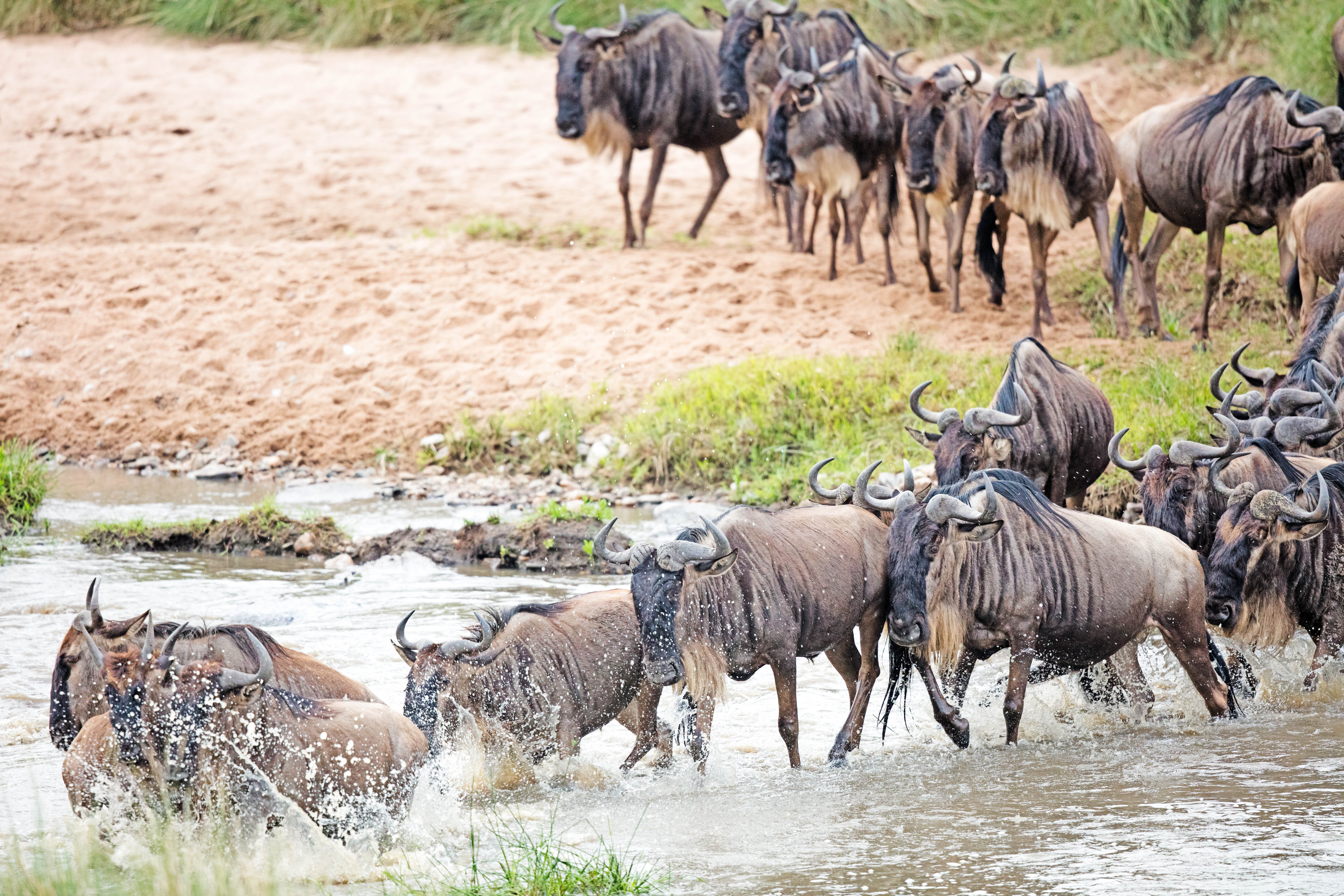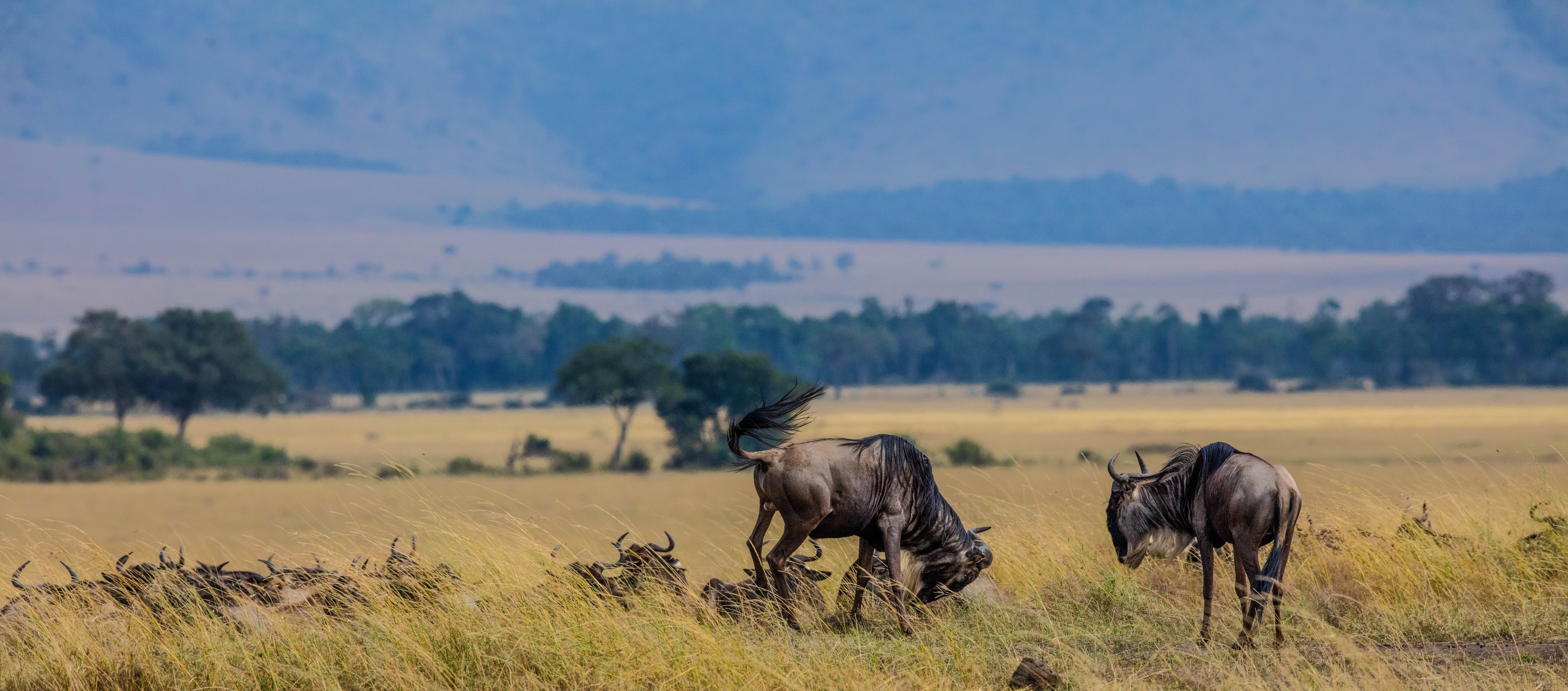 On the way back we witness our first big wildebeest crossing alas not over the Mara but one of its tributaries. Finally we have something. We can return safely and happy after the busy day.