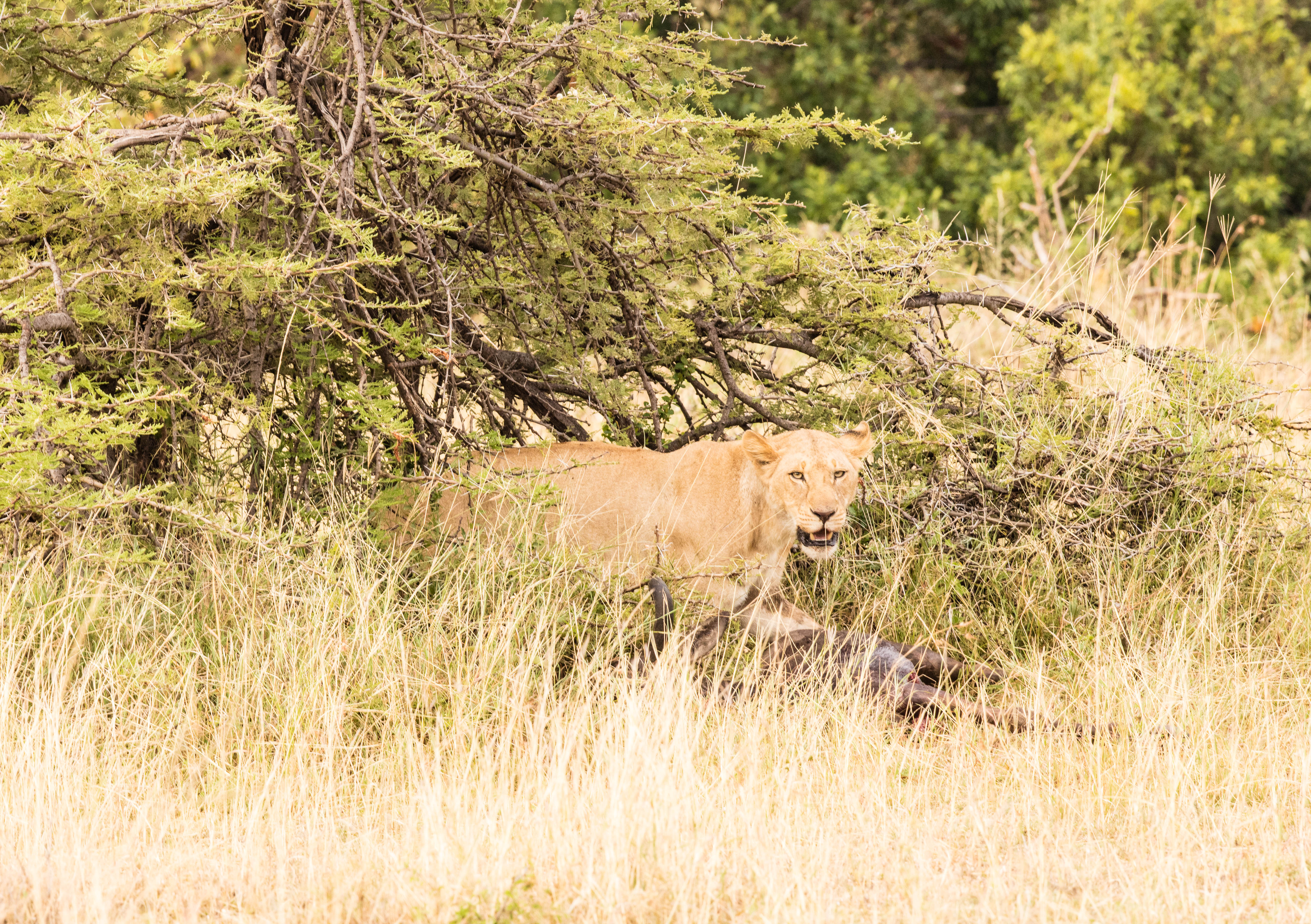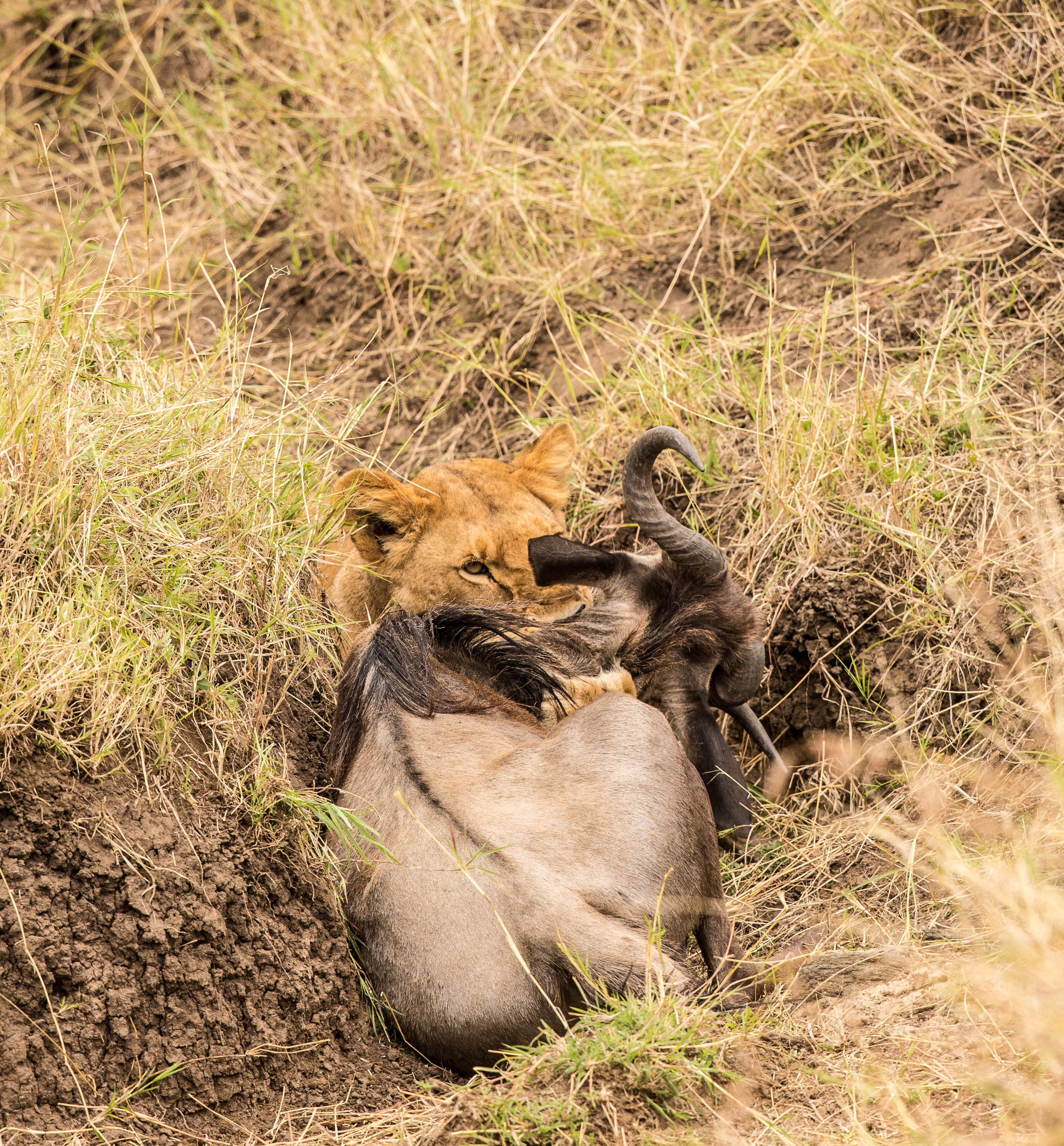 In the meantime some wildebeest start crossing upstream. Our huntress make her way along the river abutment and disappears out of site. we see wildebeest running everywhere. We reposition our vehicles anticipating a miss. In stead we find that our huntress has made a hit and was busy suffocating the unlucky wildebeest to death. After about ten minutes she starts dragging the wildebeest to a spot about 100m away that is more protected and where she can enjoy her kill in privacy. we leave her and go for lunch at nearby Mara Toto base camp.