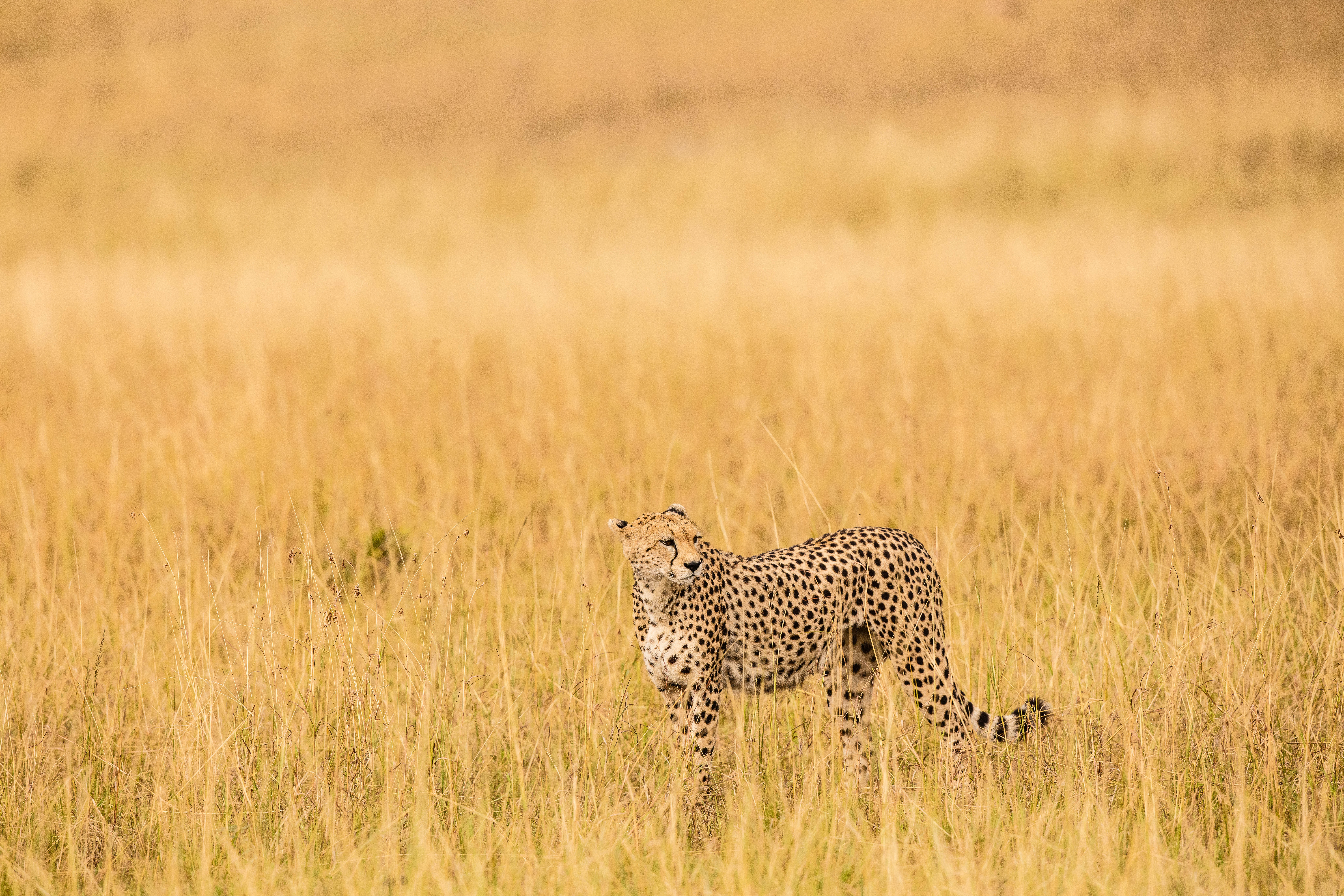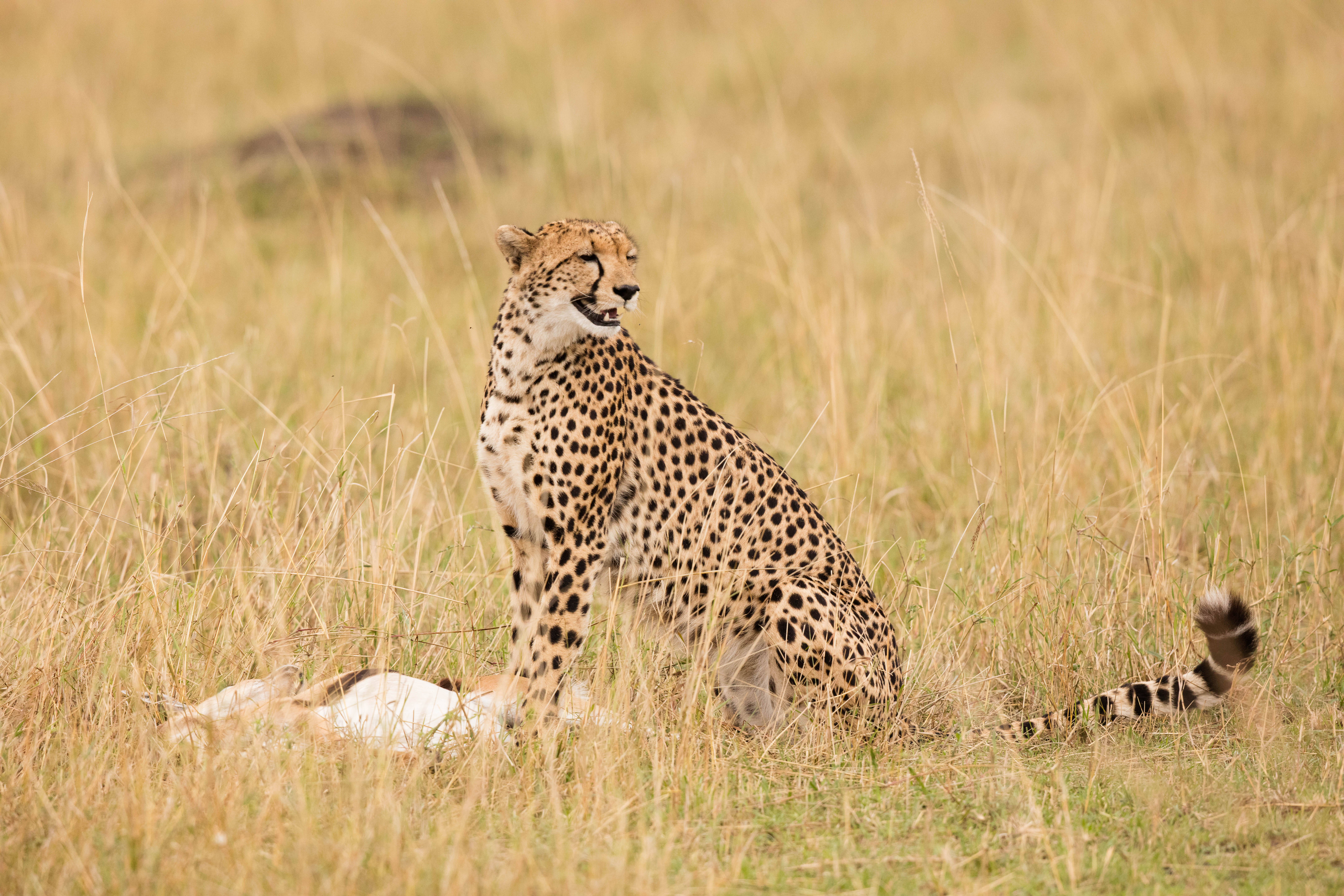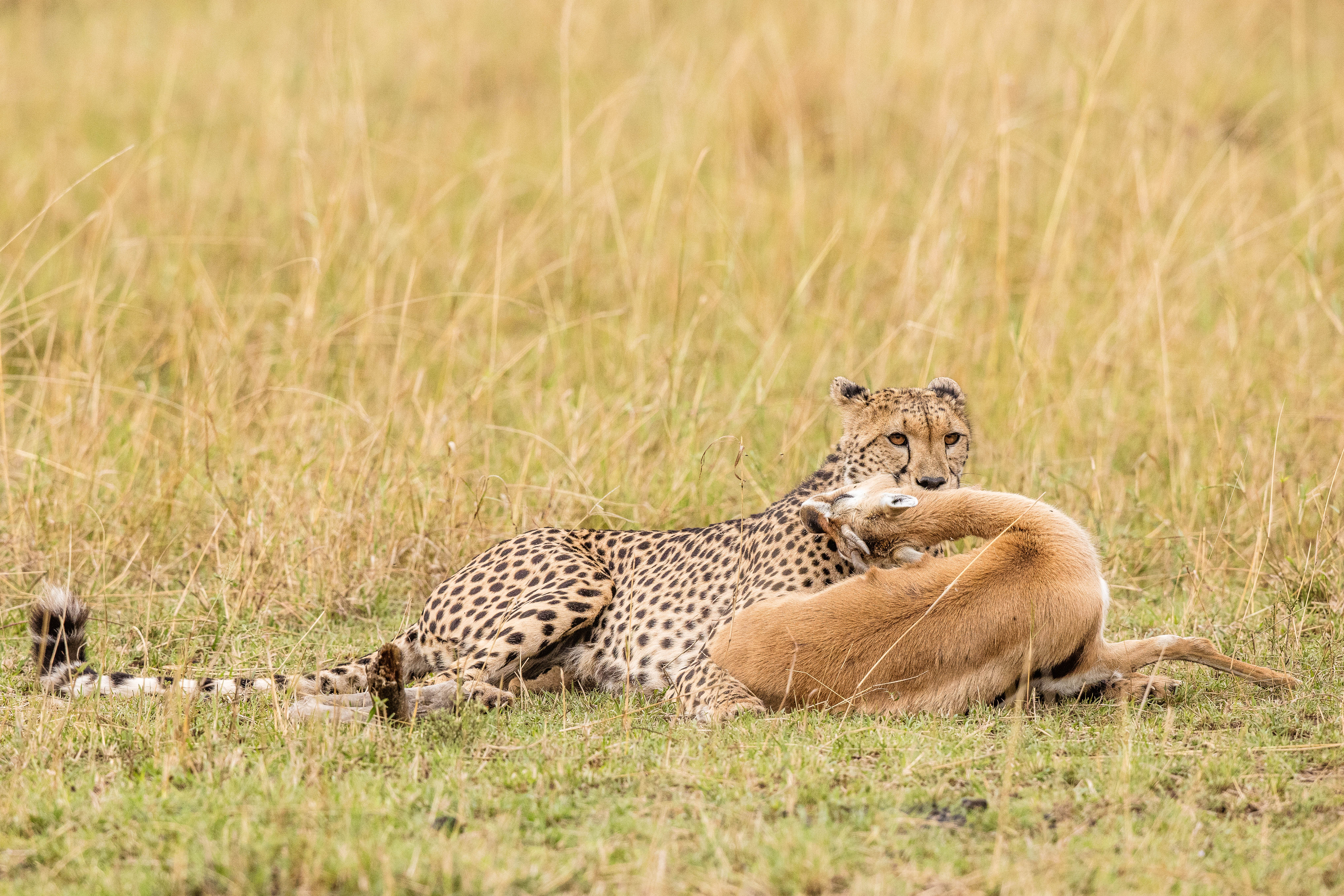 We are fortunate to find another female with four cubs close to some tommies. (Thompson gazelles). we stay frosty but despite that some of us miss the wonderful charge over about 600m as the cheetah female chases the tommy and finally overhauls it for a spectacular kill. Sadly I am not well positioned and miss the charge, damnit…