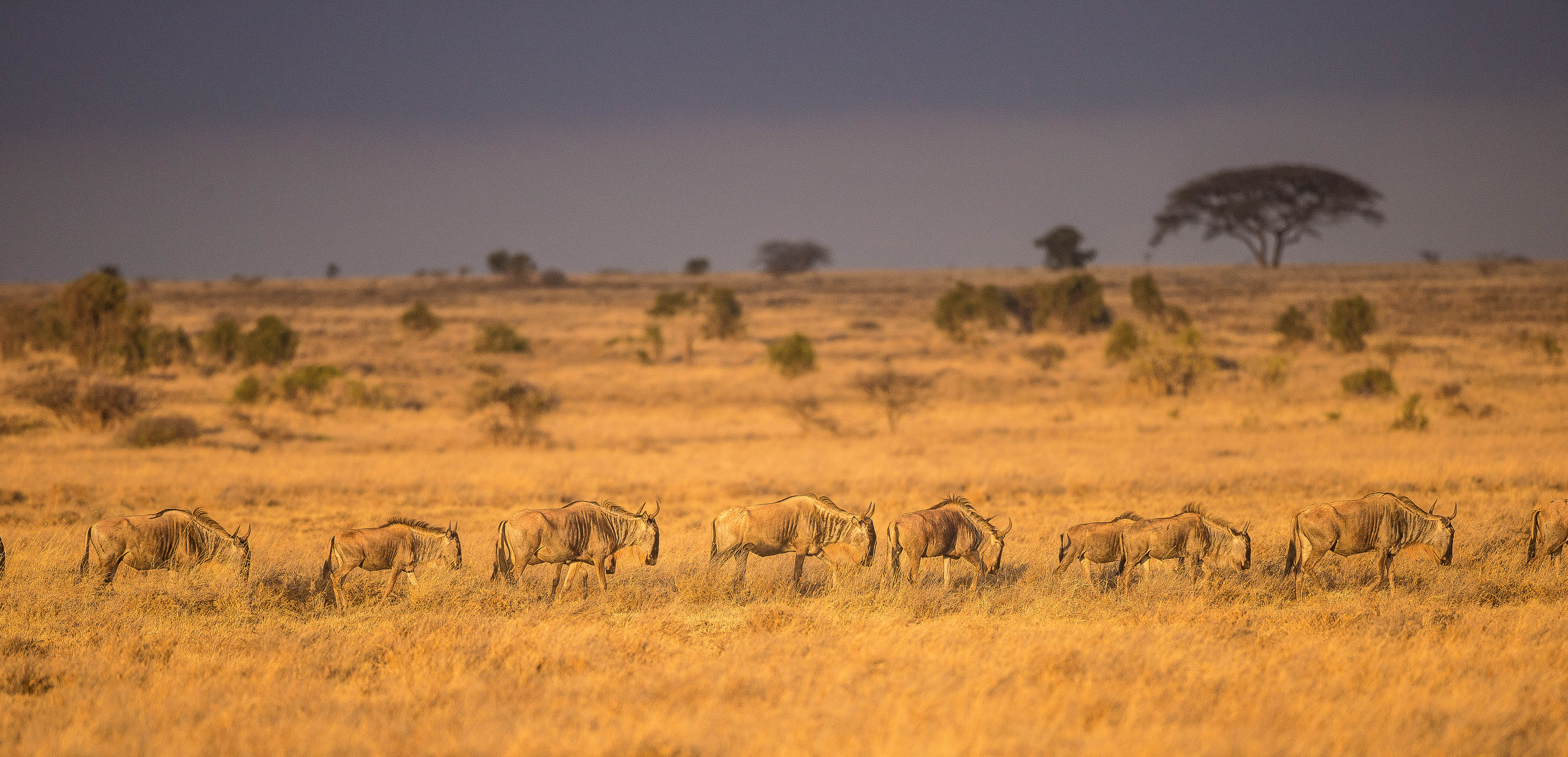 We find some great early light on the plains. We shoot wildebeest and zebra before we have a drink on top of a hill with a great vista of the Chyulu hills and surroundings