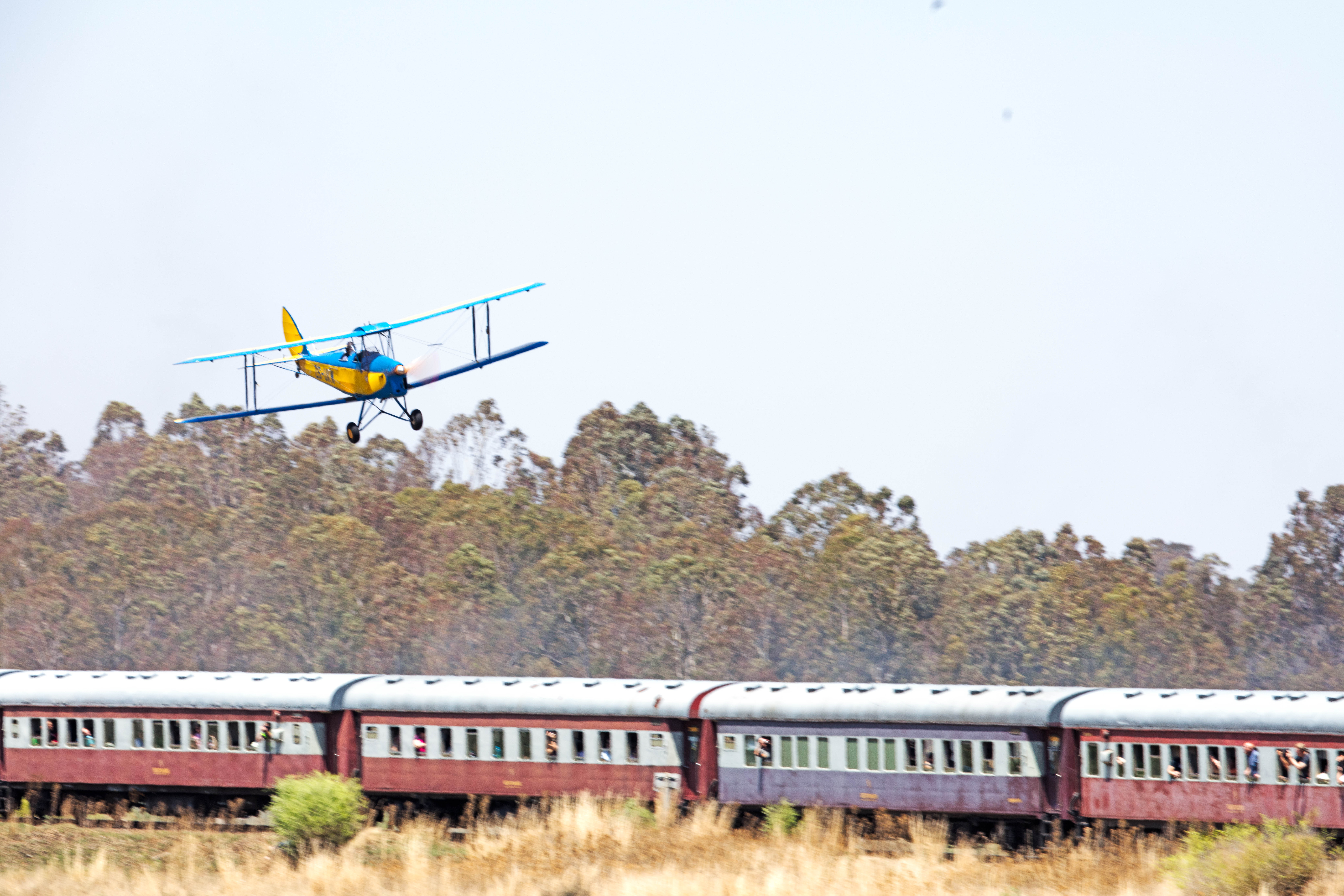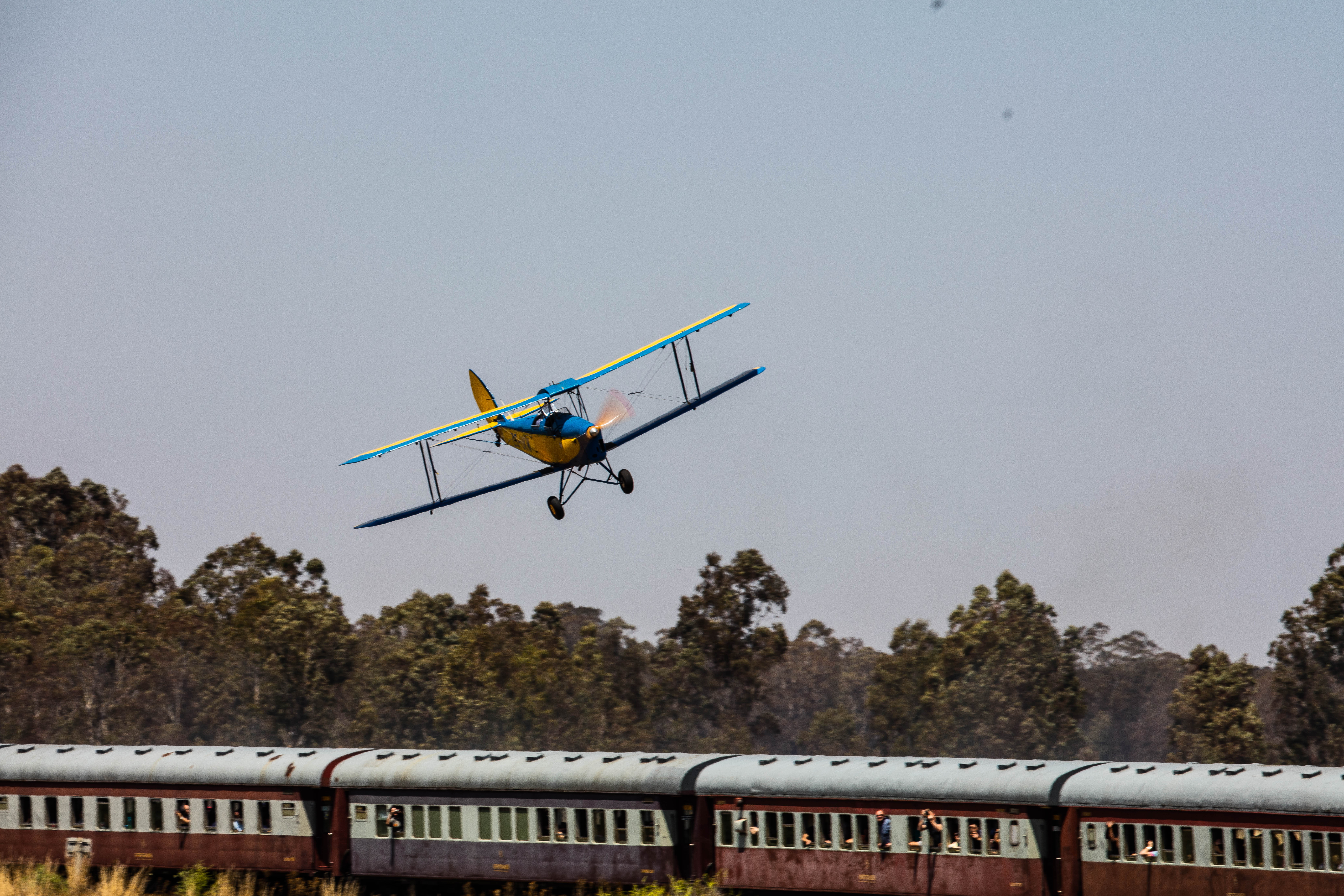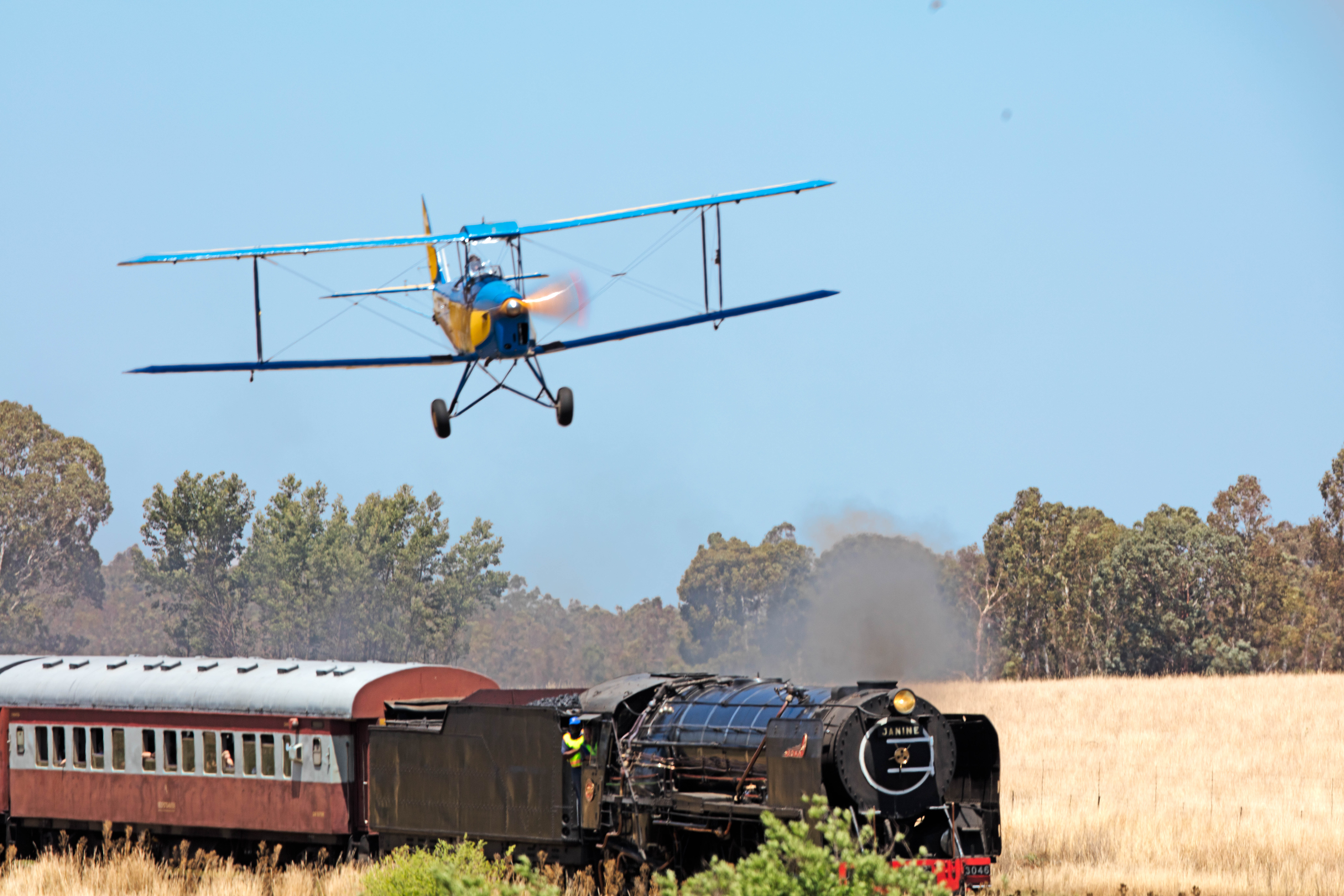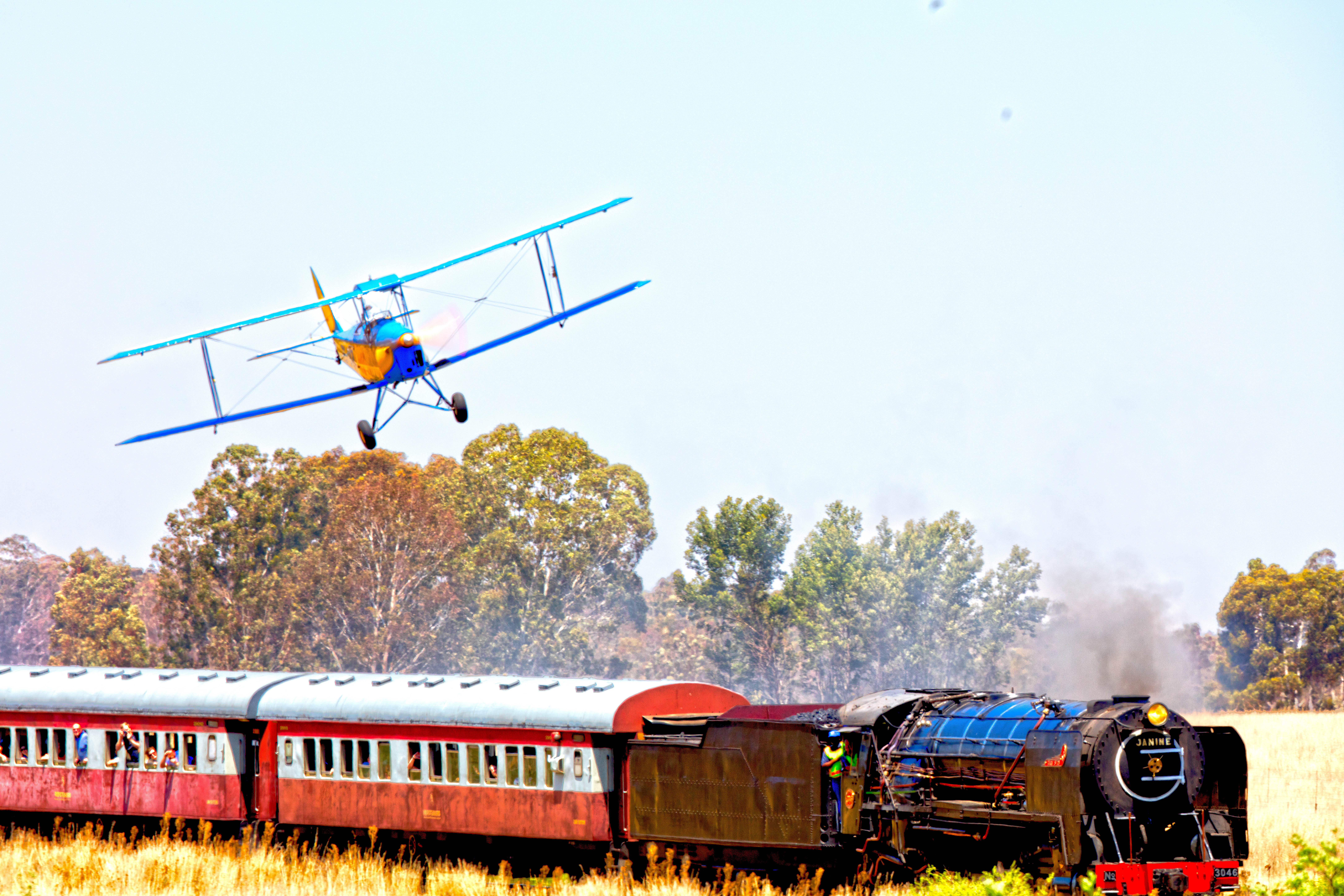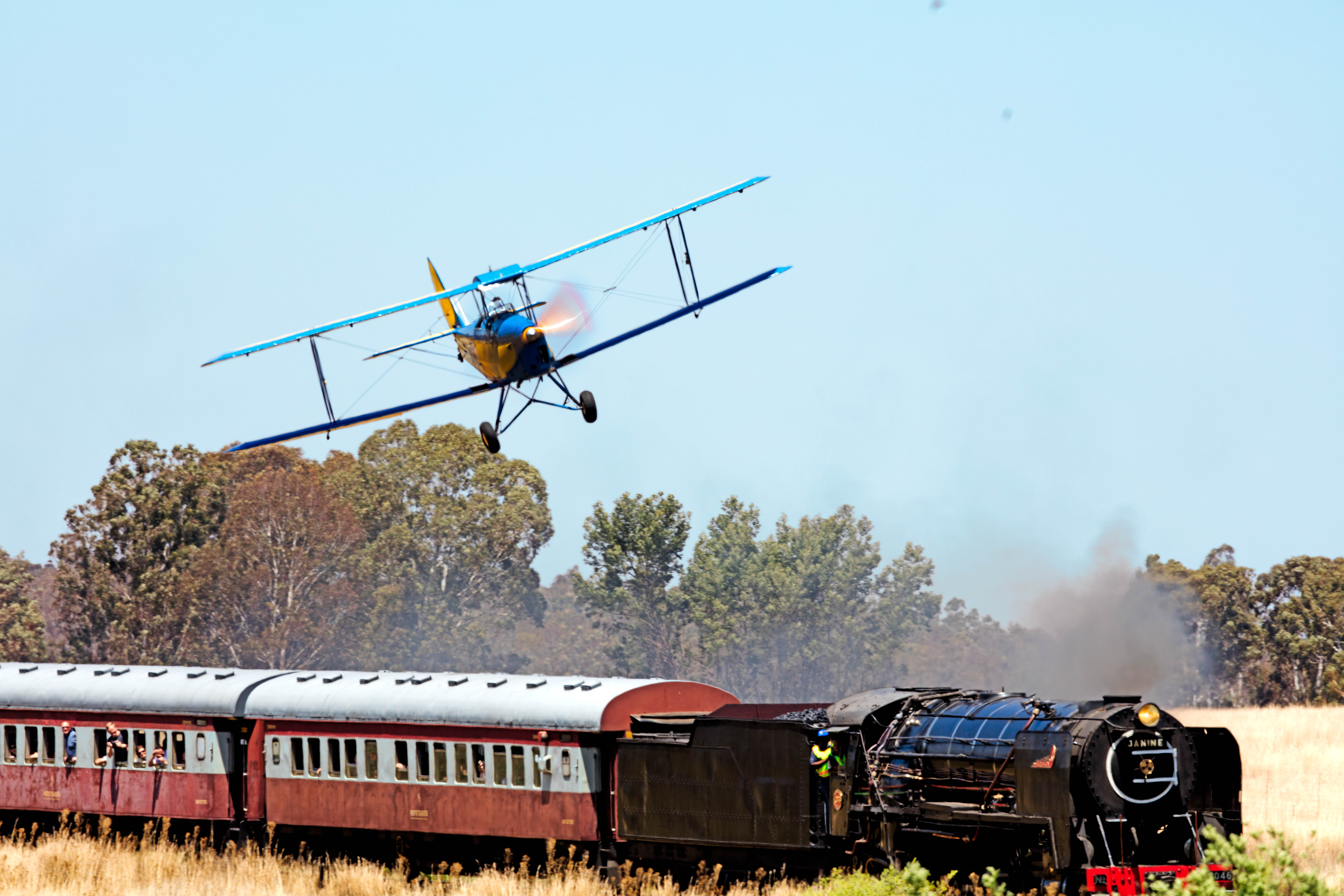 ByA nice day today near Magaliesburg, A pre WW2 Tiger moth buzzed the Reefsteamer Janine. Some memories about times of yesteryear. Enjoy, no photoshop additions, event happened as adverstised.